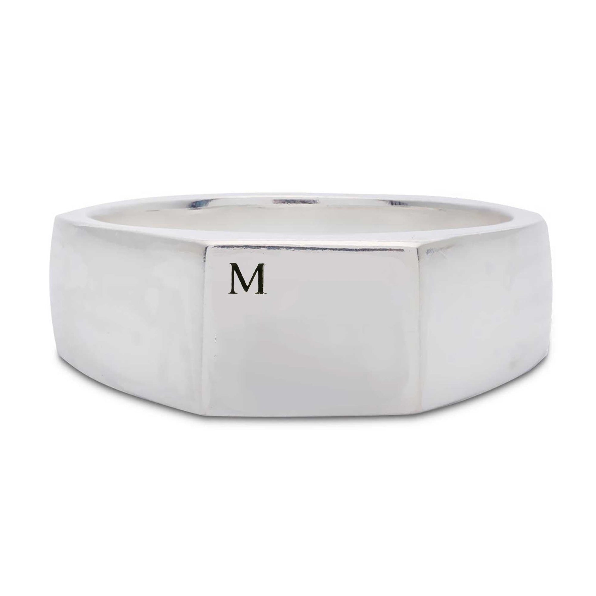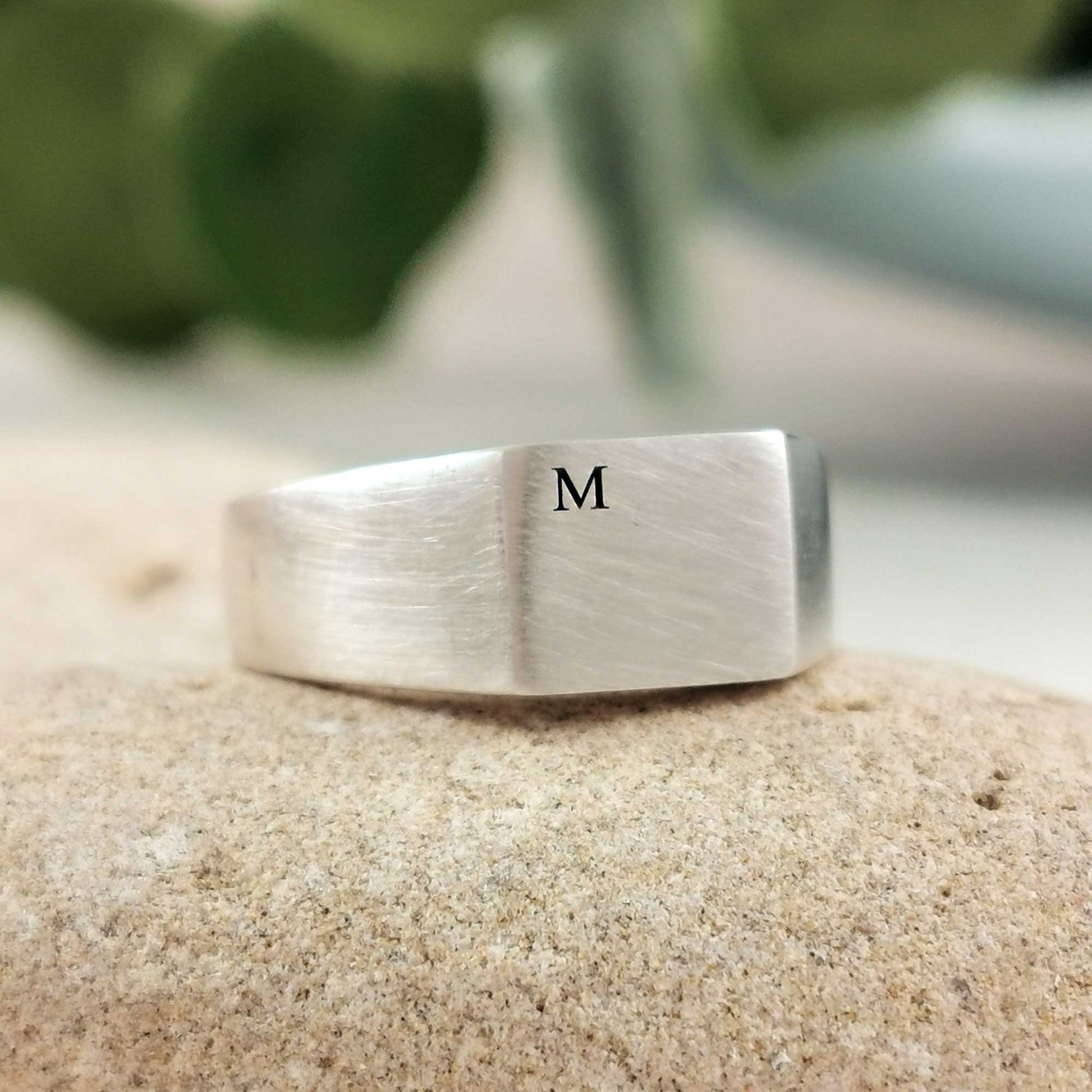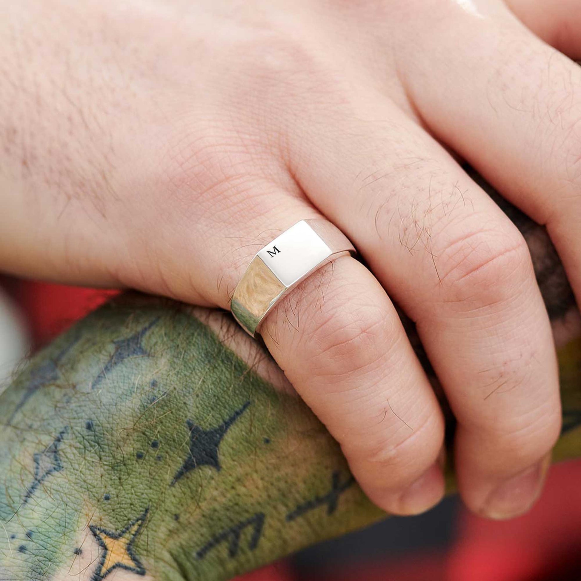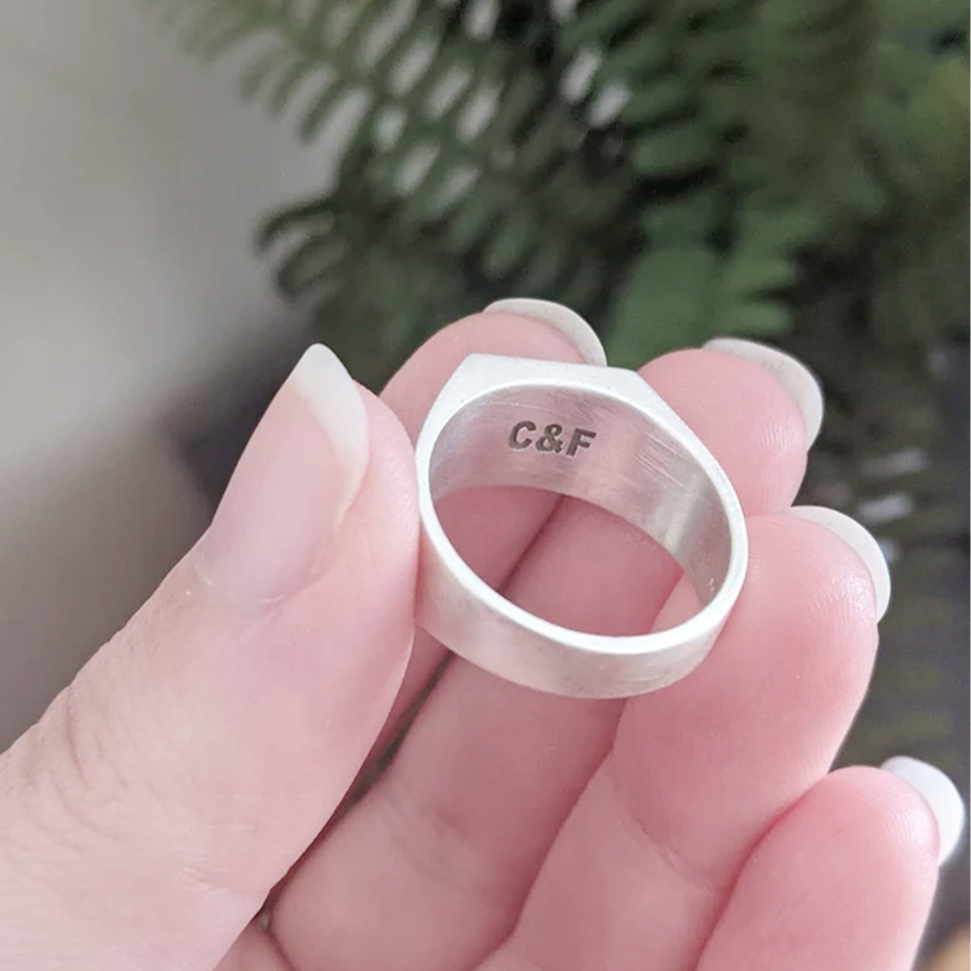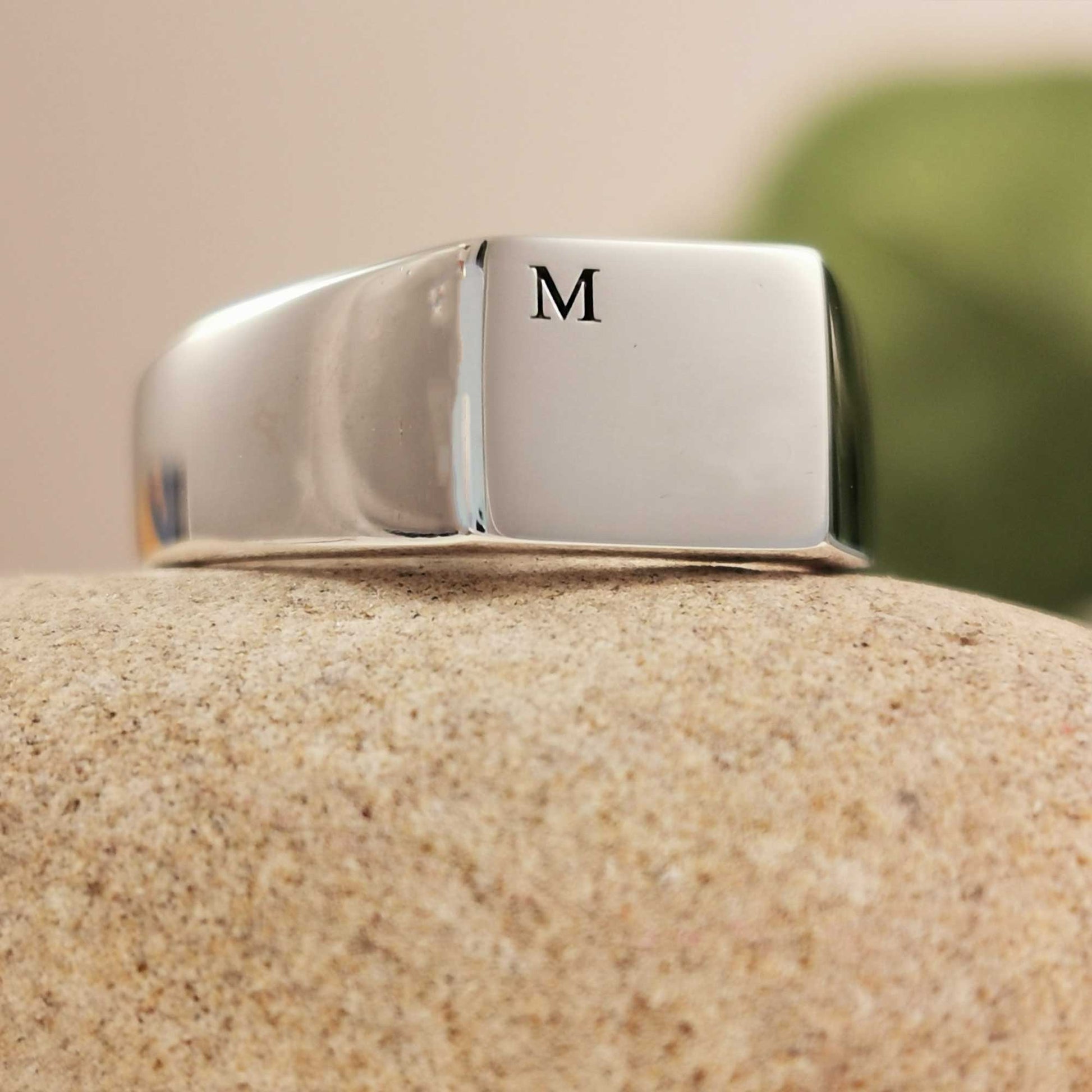 Our exquisite Initial Sterling Silver Signet Ring is a perfect personalised ring for that special someone in your life. Featuring a simple square face, it's the perfect canvas for your initials on the front and a meaningful message hidden inside the solid ring face.
