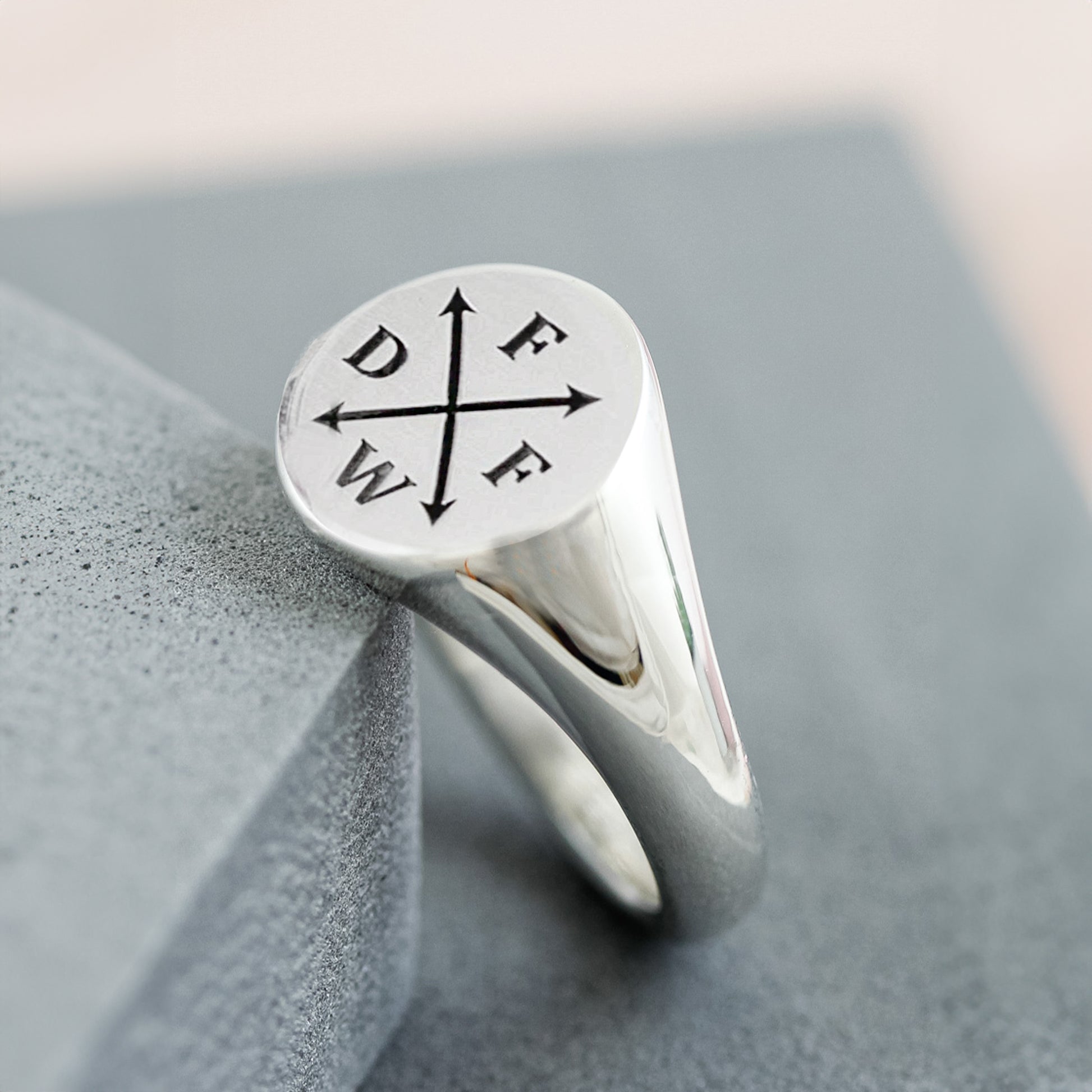 A timeless piece of jewellery, the Family Initials Large Round Signet Ring is made from solid sterling silver, offering both durability and elegance. Its unique design features crossed arrows, symbolising strength, direction, and purpose.