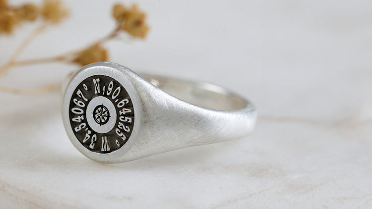 This stunning silver signet ring makes the perfect commemorative piece for your favourite spot--it could be home, a treasured beach, or any other cherished destination.