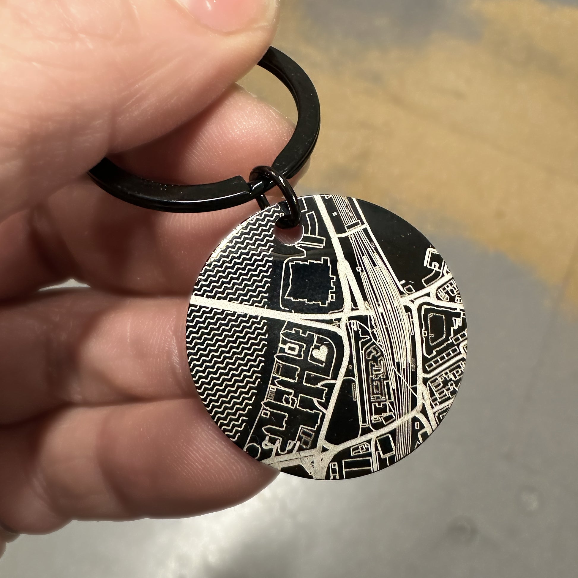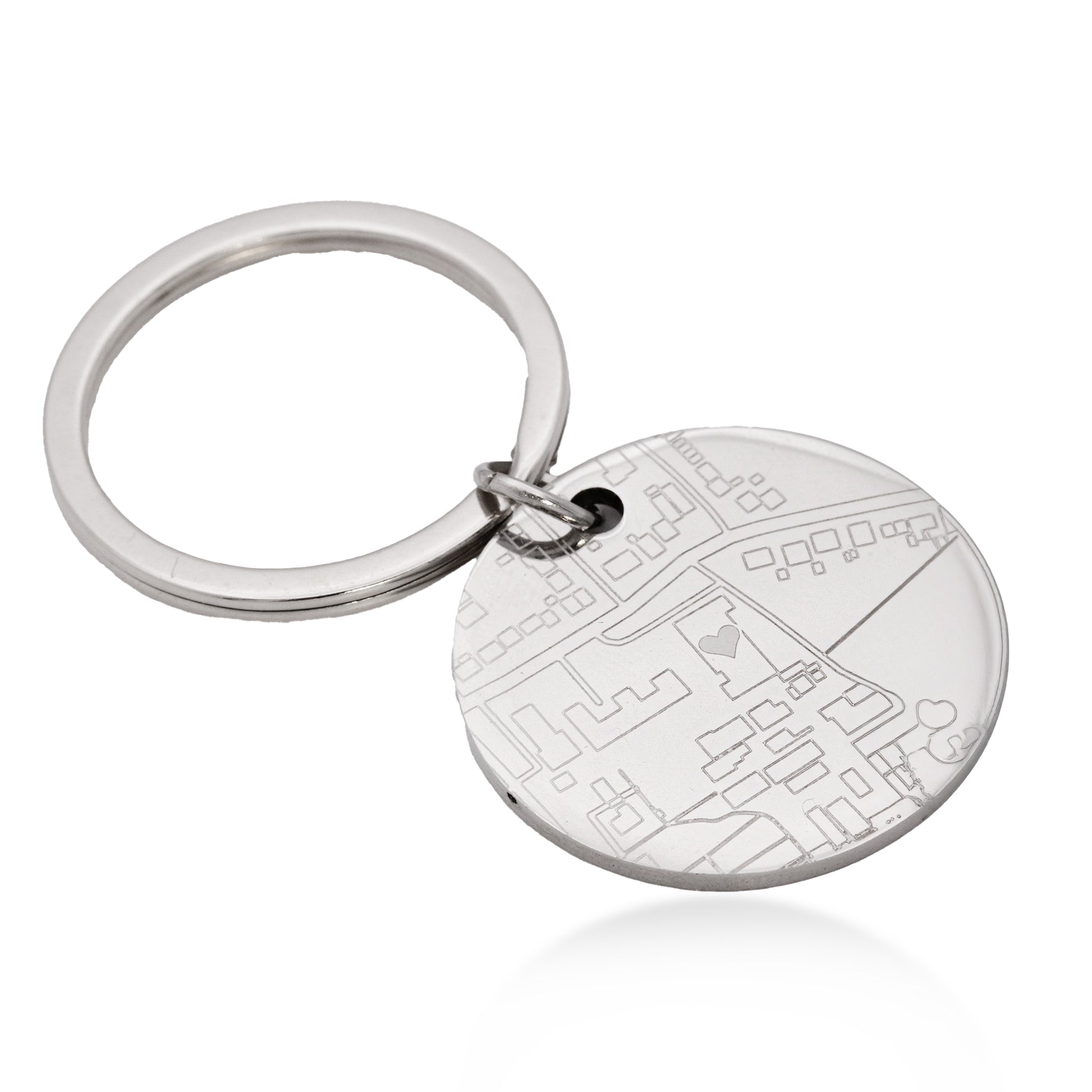 Your custom location or street map as a one-of-a kind steel large round disc keyring, a treasured gift that keeps a special place close to your heart.