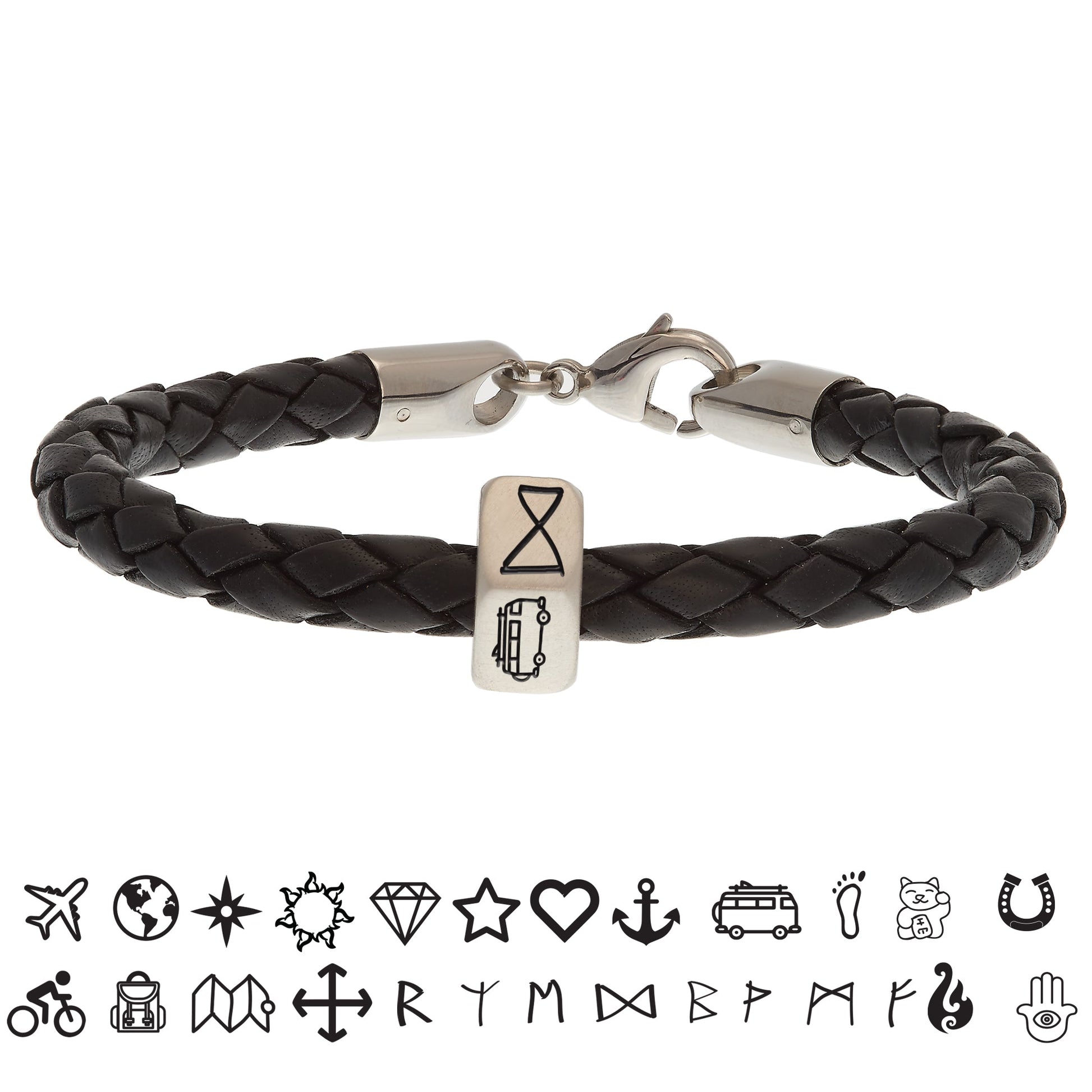 Build your own journey with this Personalised Travel Symbols Silver and Leather Bracelet! Crafted from sterling silver and featuring your choice of custom symbols, this piece is the perfect accessory for your adventures. Featuring Hamza, Lucky Cat, Viking Runes, Passport, Aeroplane, Compass and more, take this symbol of luck and wanderlust wherever you go!